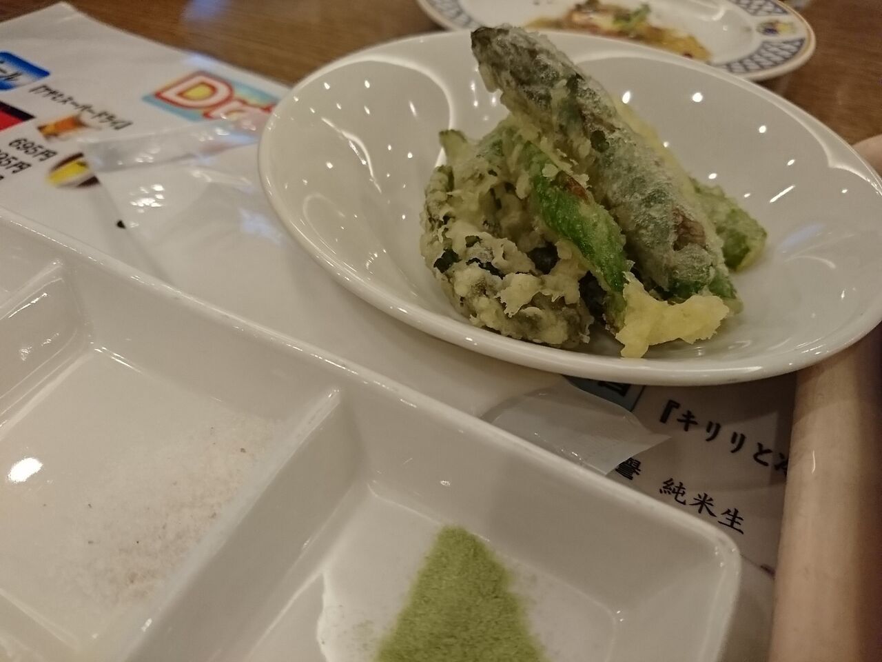 オープンキッチンでは、キノコの他になんとアスパラの天ぷらも
