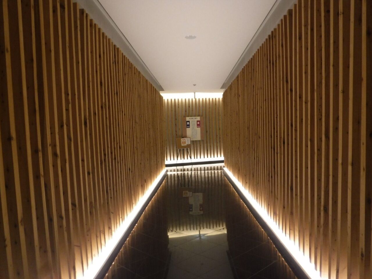 ロビーから階段で下へ、途中休憩ポイントを挟み