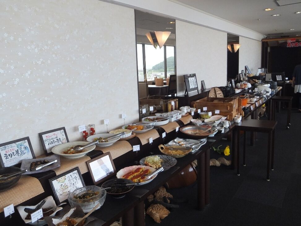 浜の母さん手作りの料理などズラリと80品が並ぶバイキング会場