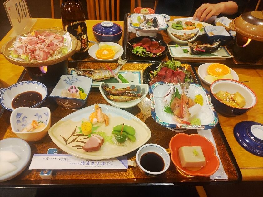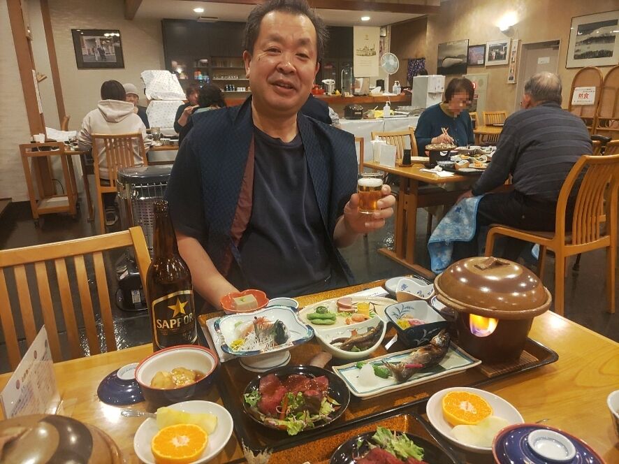 夜ご飯には湖で採れたチップとわかさぎをはじめ、テーブルいっぱいの料理が並びビールは大瓶だ