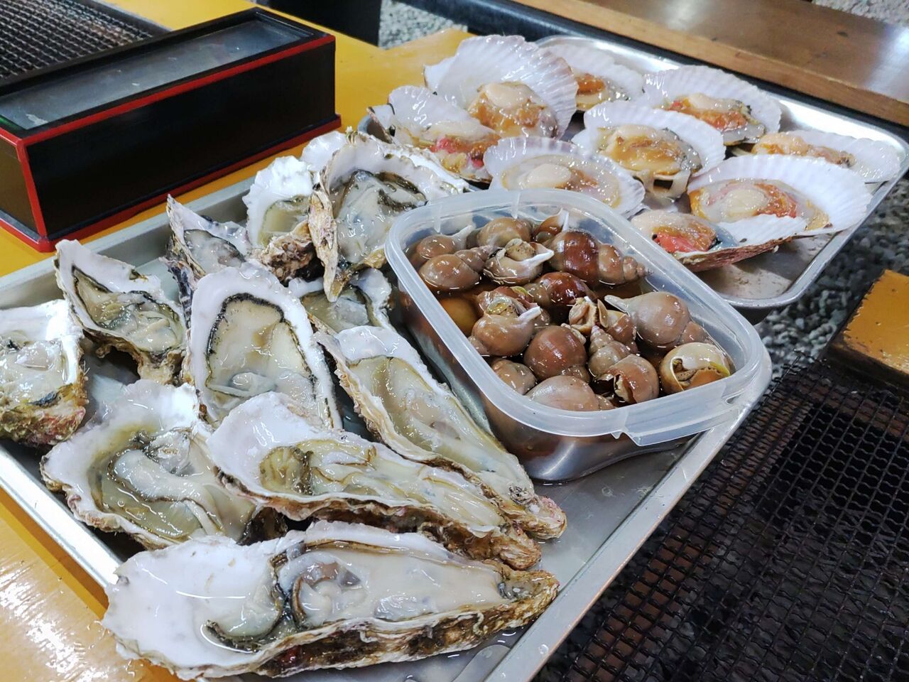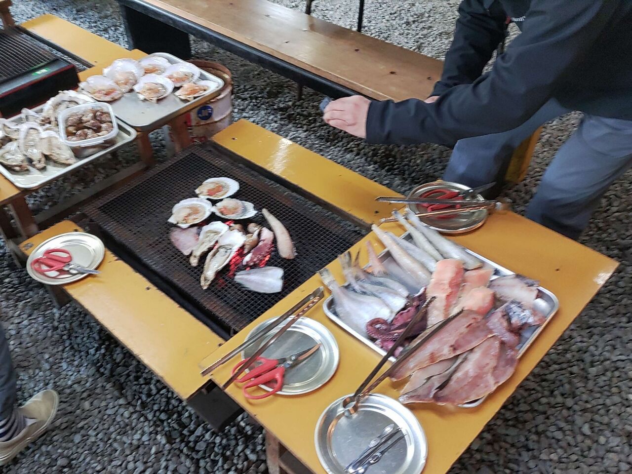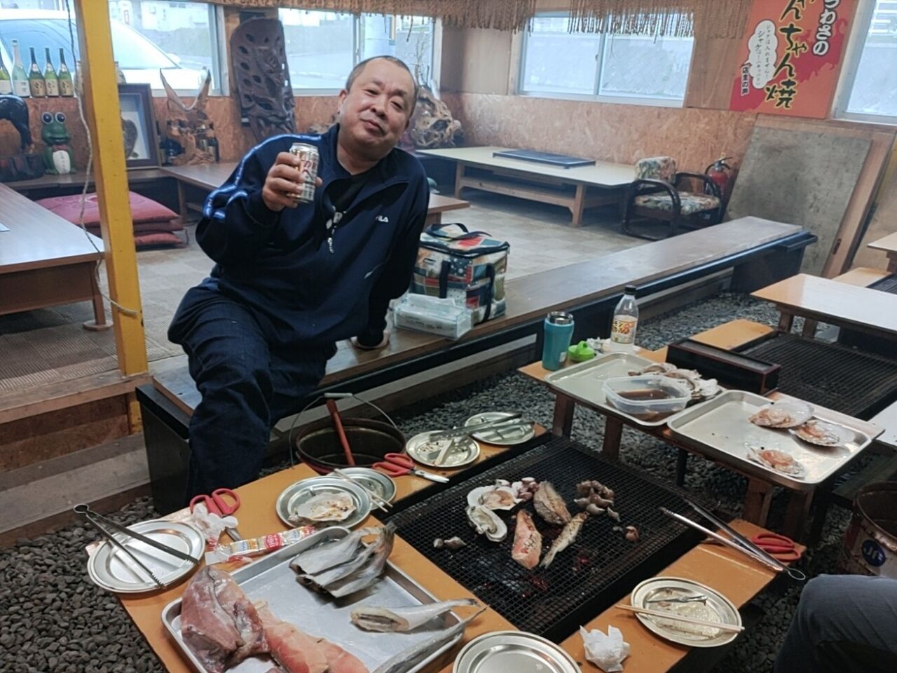 食材はその日によって違いますが、新鮮な魚介類と干物が主の海鮮バーベキューです。奥さん特製の煮つぶも山ほど出してくれました