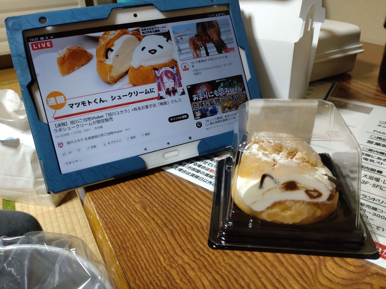 旭川壺屋で買ってきた、なんかとコラボしているシュークリーム。。移動でつぶれ悲しい顔にw