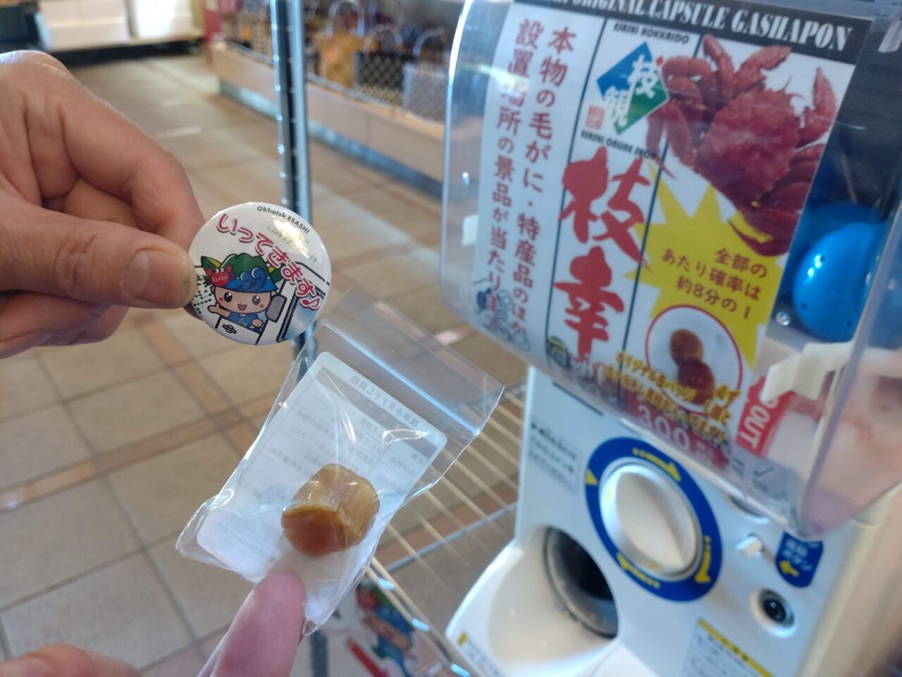 運がよければ毛ガニが当たるらしいガチャガチャも、、毎回安定の缶バッチ笑