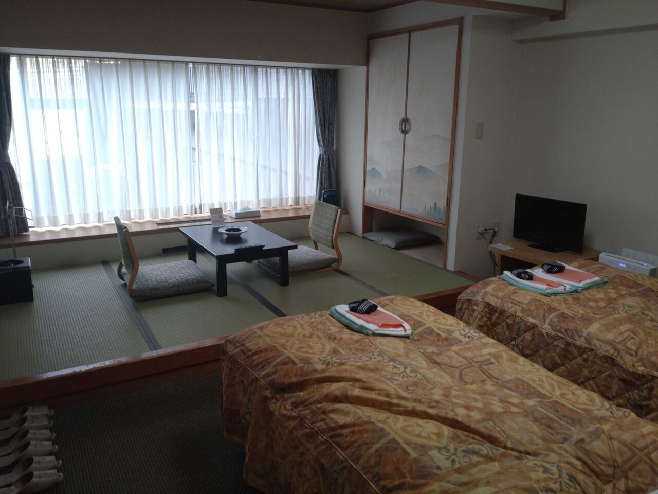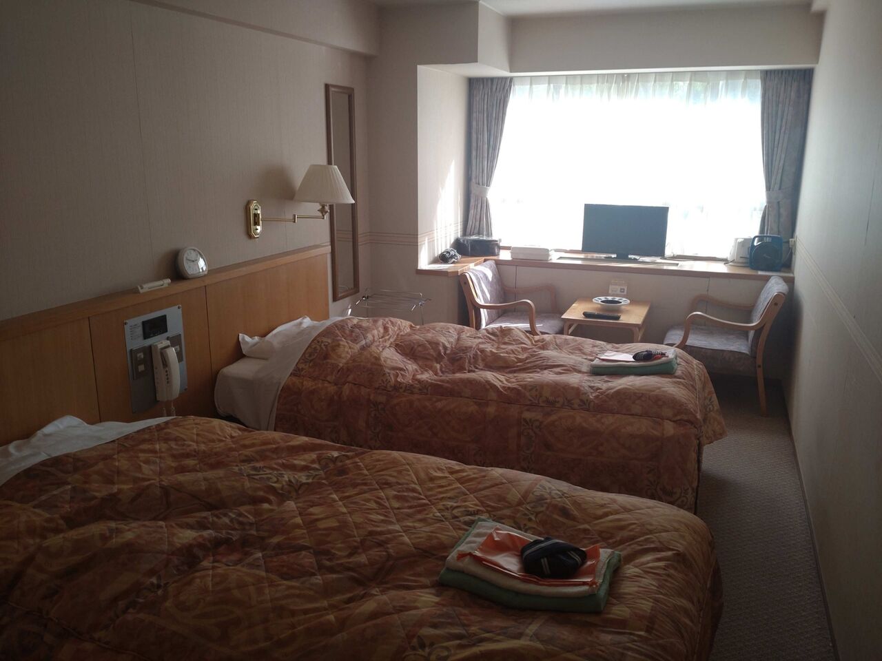 受取って開けた部屋はツインルーム。。って、予約したのは和洋室だったのでフロントに確認し部屋をかえてもらいました、撮影できたのはブロガー的にはよかったですけど(笑)