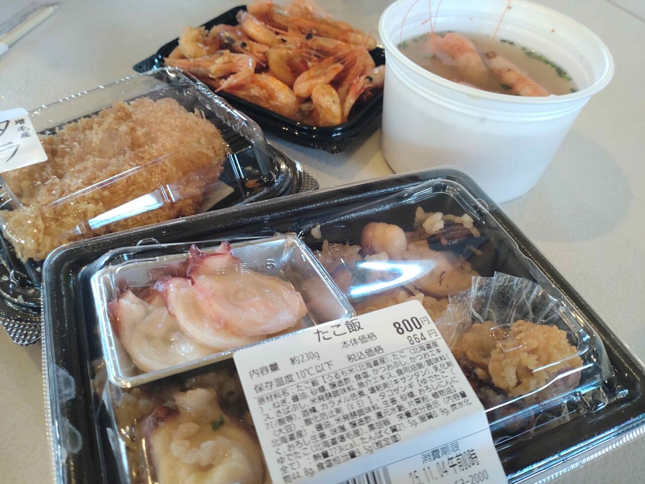 エビ汁をもらいお惣菜片手に昼ご飯〜たこ飯がめっちゃ美味かった!これはオススメ