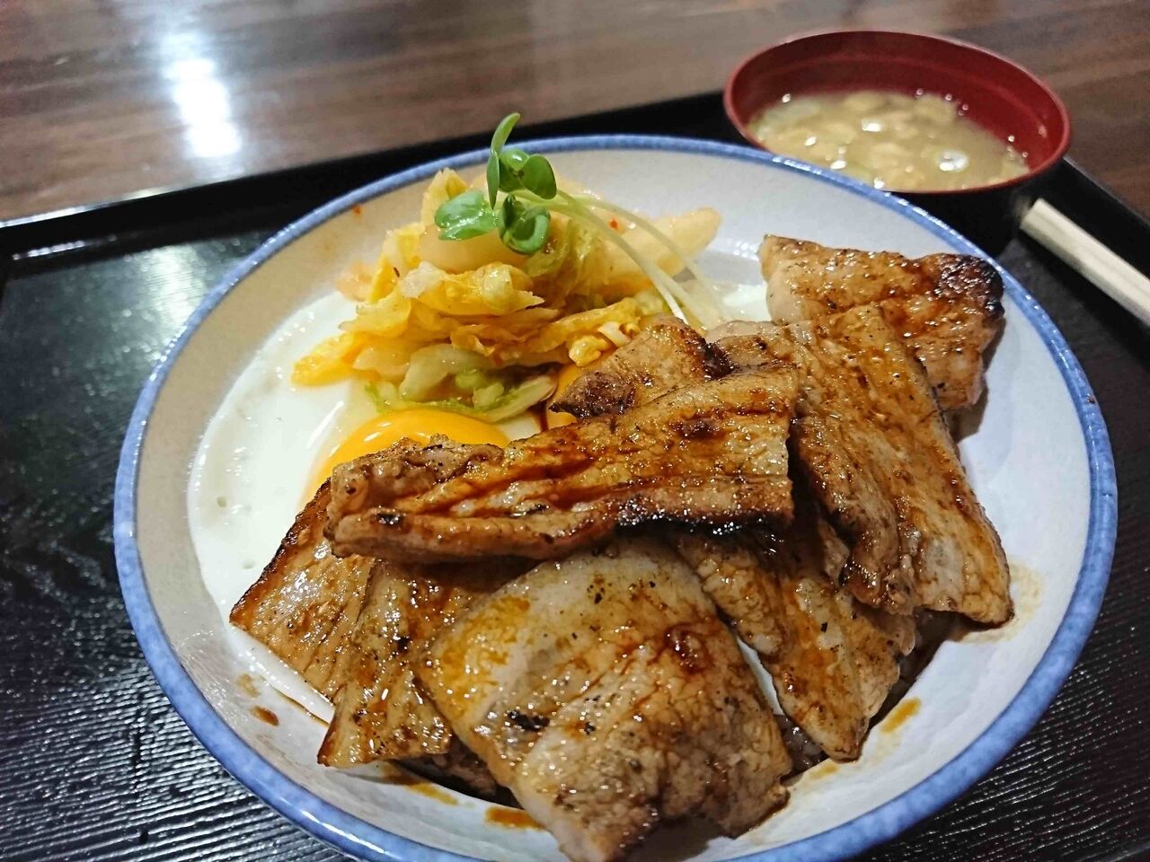 肉の下に目玉焼きが2個とキムチが添えてあります。