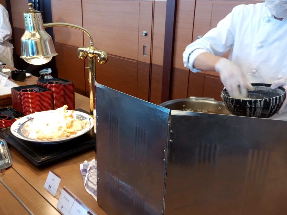 実演は目の前で揚げてくれる5種類の天ぷらと