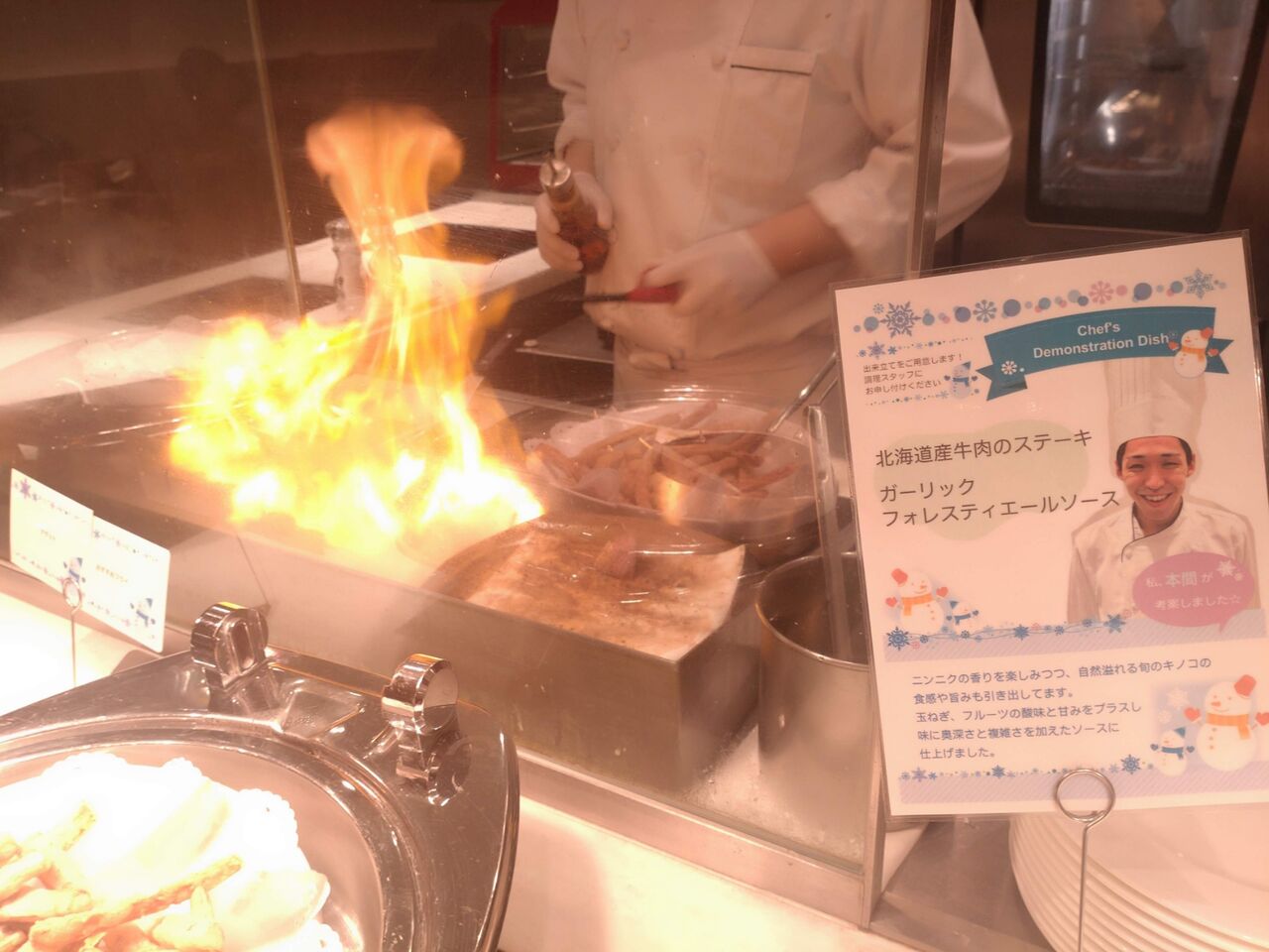 ホテルの料理人達の腕とアイデアで作られた創作料理が並びます、オープンキッチンでは定番のステーキ等が大人気!