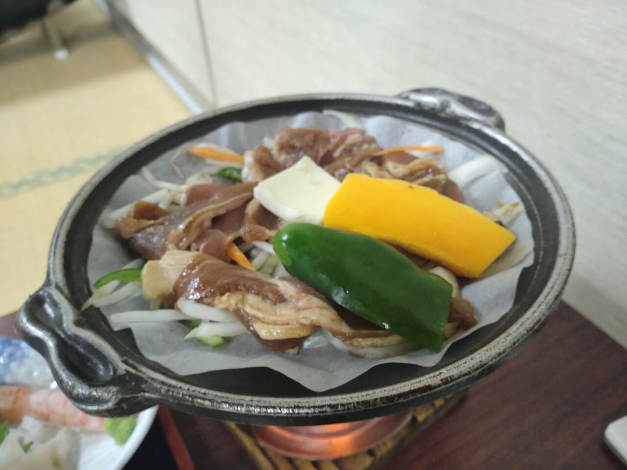 ジンギスカン鍋、毎度ながら焼き物は火力が足りないかな。。じっくり焼きたい人は遠慮なく固形燃料追加をお願いしましょう