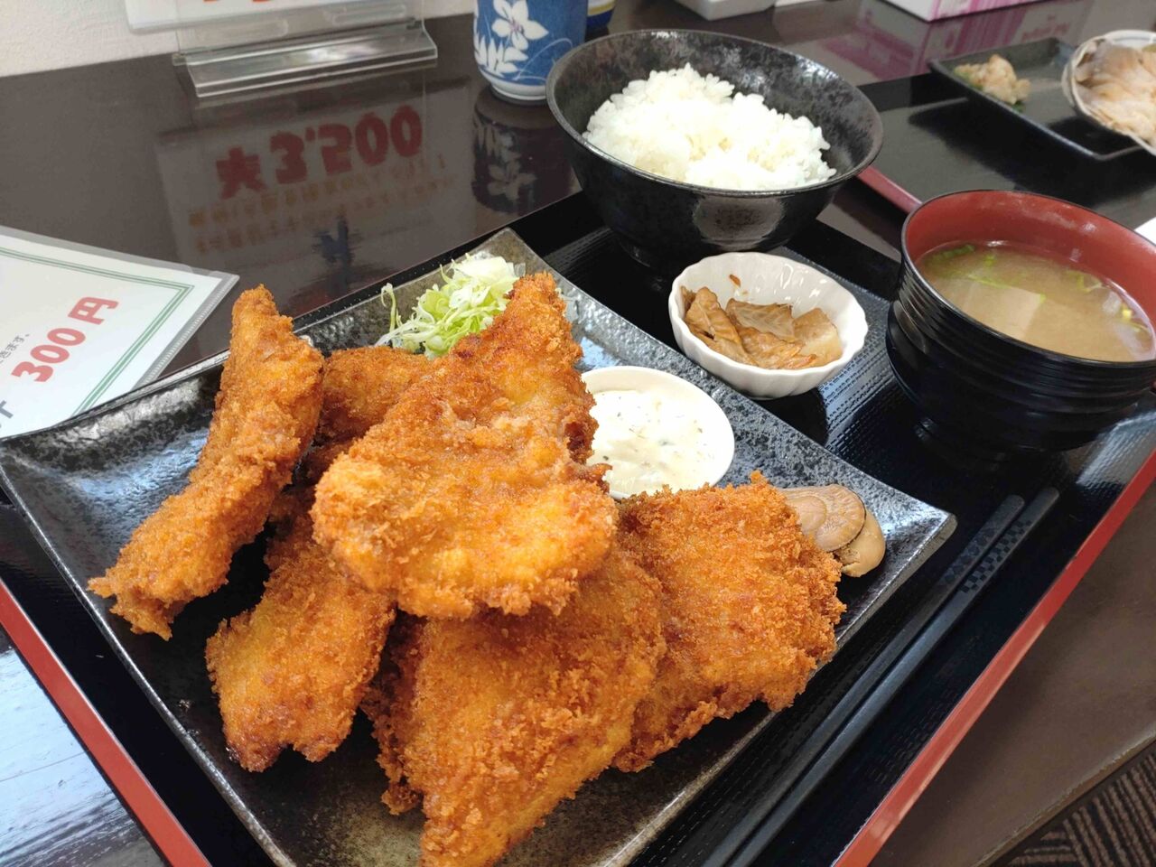 相方は虎杖浜名物たらフライ定食を、半身使ってるみたいでかなりのボリューム。とても喰いきれんとゆう方には持ち帰りパックもあるのでご安心を、しかしこれで1200円はお得だわ〜