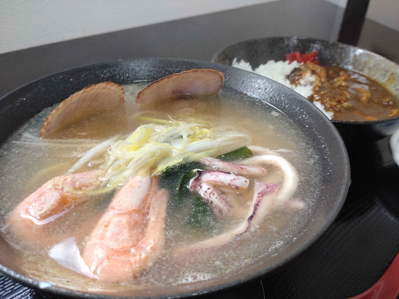 海鮮入ったたっちゃんラーメンとミニホッキカレーのセット、ミニとはいえ十分な量のカレーでした、ラーメンも出汁がめっちゃ旨っ!