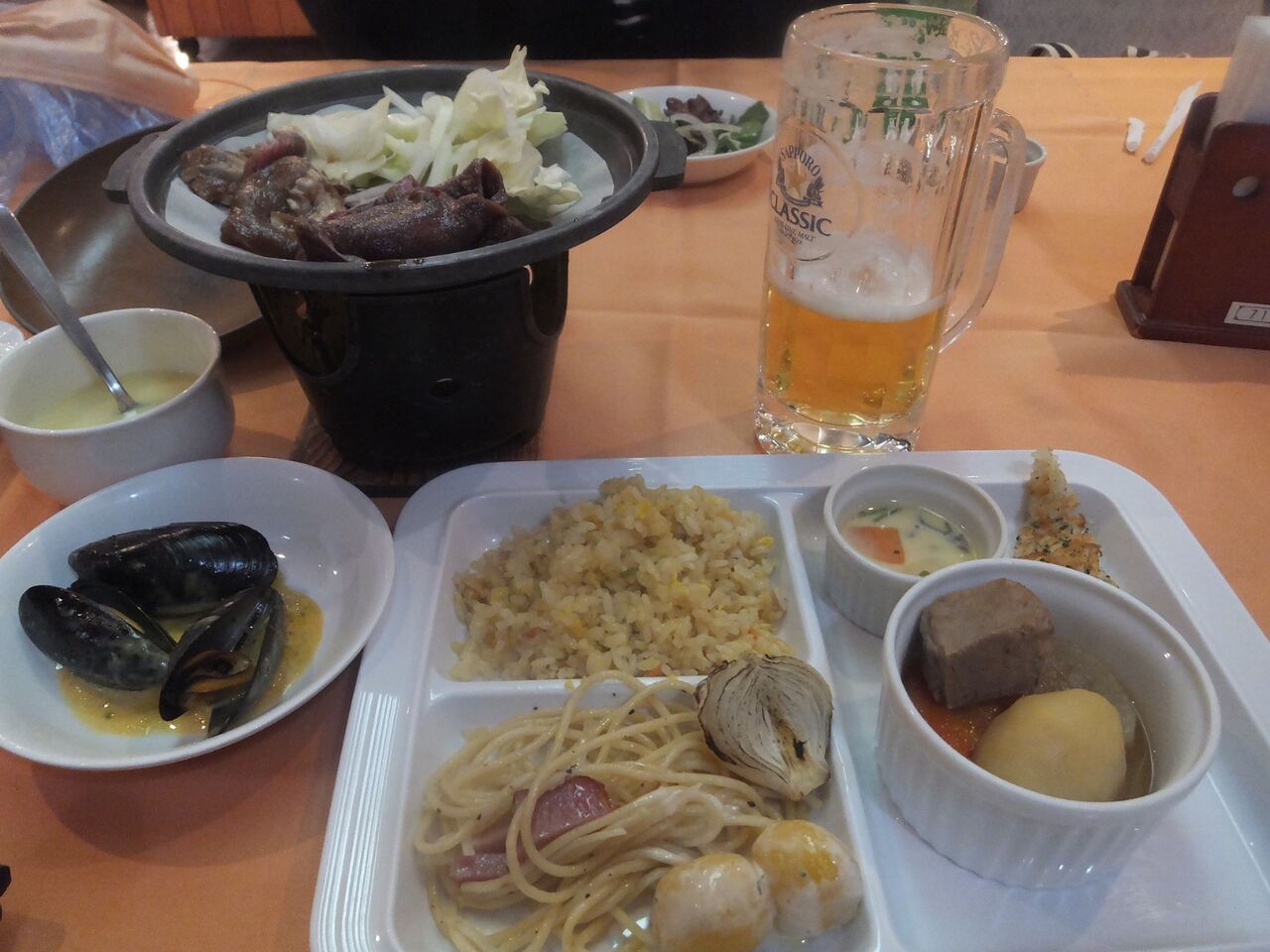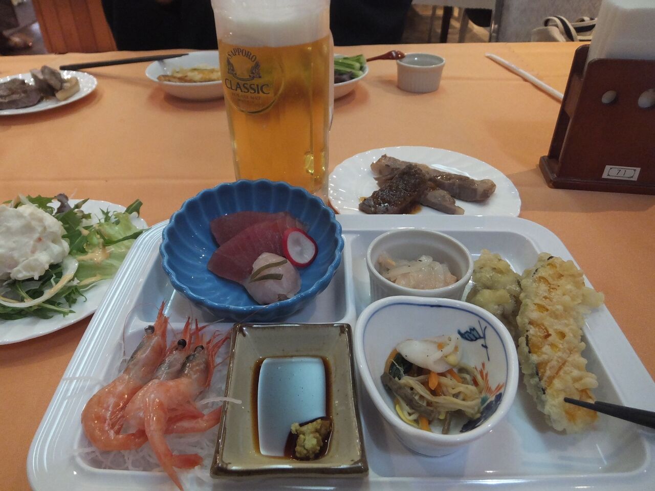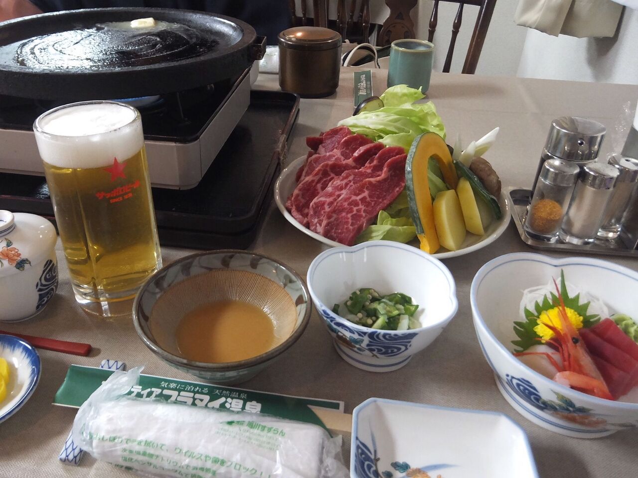 牛肉と少々の魚介類、刺身などもありちょっと豪華♪生ビールは600円でした